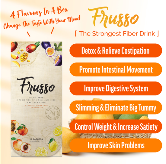FRUSSO is a flavourful drink rich in fibre & prebiotics that helps to relieve constipation, manage weight and trim waistlines. It is in powered form, and comes in four fruity flavors: Mango, Lemon, Passion Fruit and Peach.